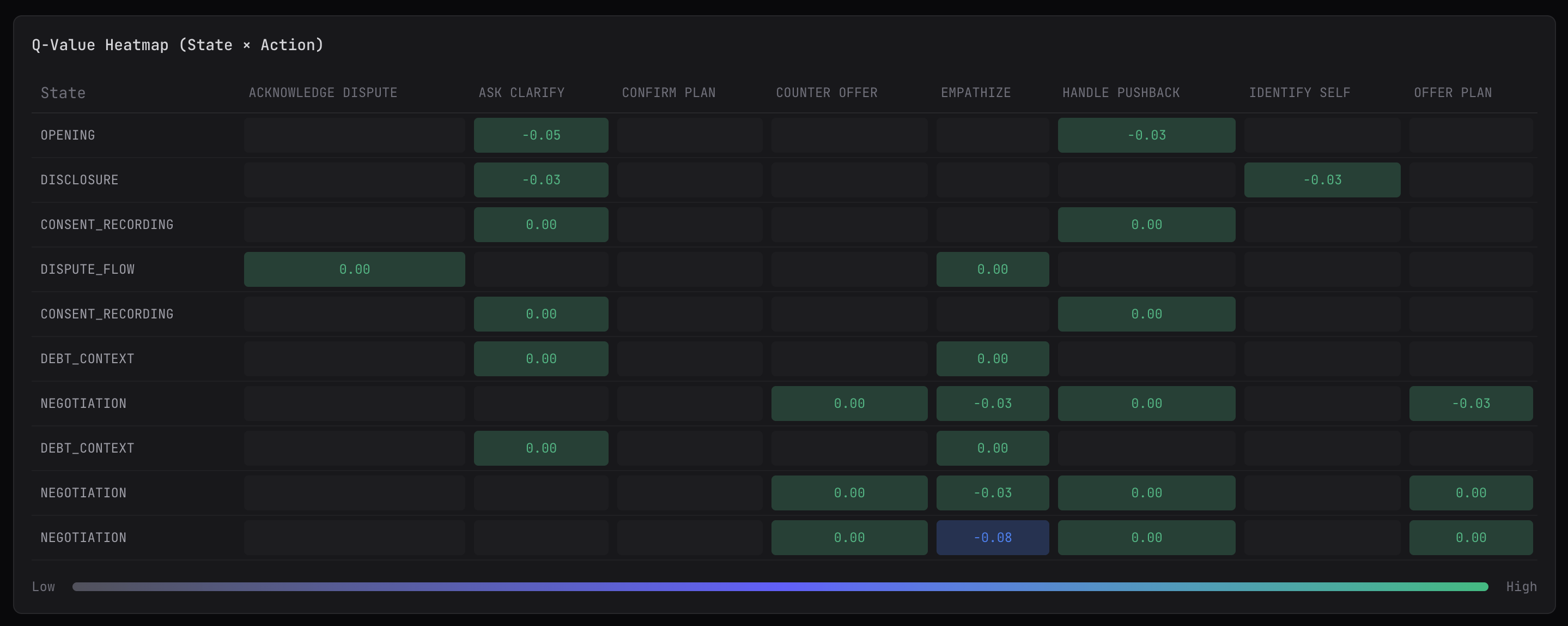 // Scenario Bconst rewardB = await llmJudge.rate({context: "Borrower offered $50/month, agent accepted",response: "I hear you - $50/month works. Let's set that up.",outcome: "hangup"});// Returns -0.2: "Good empathy, reasonable offer. Borrower likely wasn't going to pay regardless."The Q-table learns different values: