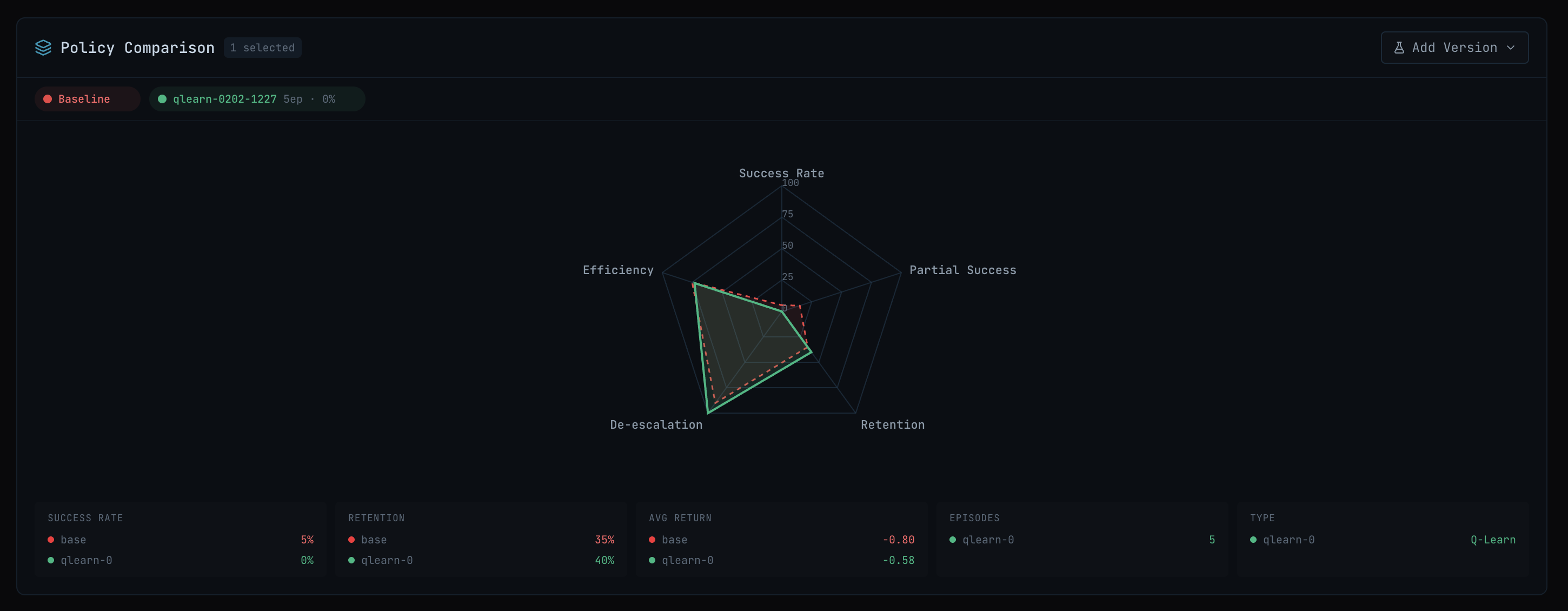 Hardcoded Q RLAIF QNEG|neg|5, PROCEED -0.3 -0.5NEG|neg|5, EMPATHIZE -0.3 +0.1Hardcoded treats both hangups the same. RLAIF learns that EMPATHIZE in hostile situations is good and the outcome was bad but the action was right.